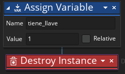 Esta variable sera la encargada de permitir salir o no por la puerta, mientras sea igual a 0 no podremos, cuando lo pasemos a 1 sera posible, la siguiente modificacion sera agregar un evento de tipo Colision pero con el objeto obj_Llave, en esta agregaremos otro Assign Variable, al cual llamaremos tambien tiene_llave pero le asignaremos el valor de 1, lo siguiente sera agregarle un Destroy Instance, presionamos la flecha hacia abajo y en la nueva ventana seleccionamos Other, esto eliminara el objeto de la llave, debera quedar de la siguiente manera