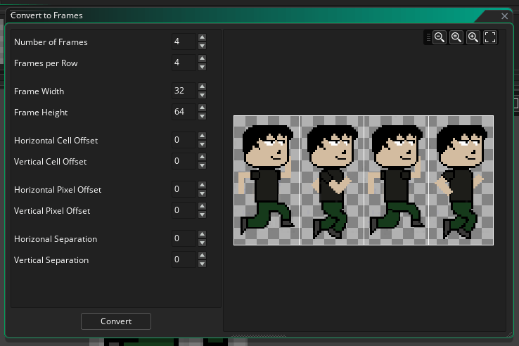 En este caso debemos establecer el numero de frames en 4, la cantidad de cuadros que tenemos, el numero de frames por cada linea o row, luego definimos el ancho y el alto de cada uno y le definiremos el tamaño de nuestro sprite, el resto dejenlo como aparece, presionan Convert para convertirla, aparecera una notificacion avisando que reemplazara los frames existentes y presionen Yes para hacerlo, una vez hecho quedara de la siguiente manera