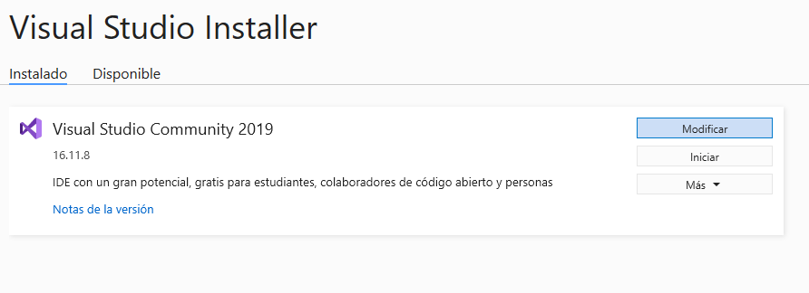 Lo primero que haremos no sera abrir al Visual Studio sino que abriremos el Visual Studio Installer
