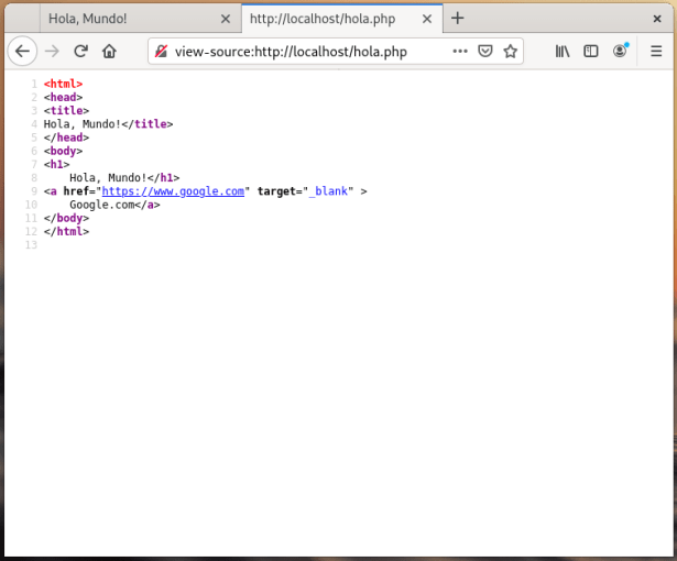 Como pueden ver es una pagina simple creada donde tenemos varios tags dentro del cuerpo de la pagina y funcional, tomemos esta misma pagina y la convertiremos a PHP, la primera modificacion sera crear un nuevo archivo llamado hola.php en el mismo lugar donde creamos el anterior y le agregaremos el siguiente codigo: