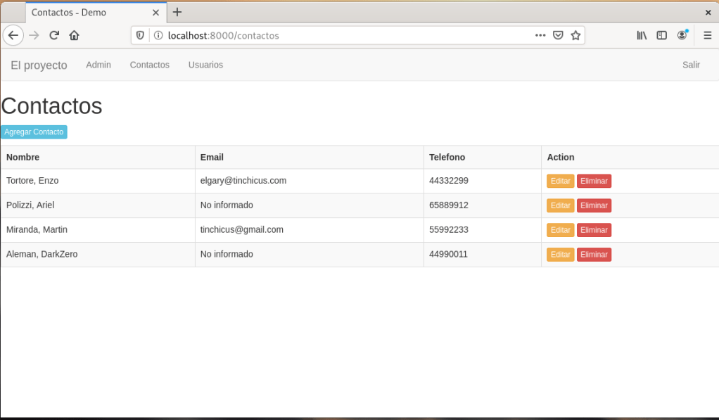 Esta va a ser la pagina de inicio de los contactos, como siempre tendremos nuestros cuatro archivos de layouts (header, nav, errores y footer), luego tendremos una tabla donde se mostrara el nombre completo, el email y el telefono, finalizando en dos acciones, editar y borrar, esto gracias al dato que le enviamos desde el metodo index, tambien tendremos la funcion en javascript que se encargara de eliminar al contacto pero antes nos preguntara si queremos hacerlo, les dejo un ejemplo de como se ve