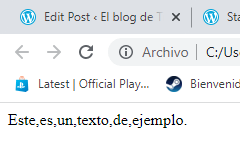 En este ejemplo bien simple primero definiremos una funcion, nuestra primera accion sera definir una variable de tipo String llamada texto, lo siguiente sera generar un array mediante el split, del cual hablamos en este post, del texto almacenado en la variable definida anteriormente, por ultimo escribiremos en el cuerpo del html el resultado de aplicar toString al array antes generado, el ultimo paso en el codigo sera en el body del html el llamado de la funcion anteriormente definida, con todo esto comentado veamos como es su salida