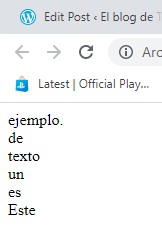 En este simple ejemplo primero definiremos una funcion donde nuestro primer paso sera definir una variable a la cual llamaremos texto, en esta almacenaremos un mensaje, lo siguiente sera definir un array mediante la aplicacion del split sobre la variable anterior, para saber mas sobre este metodo les recomiendo este post, luego usaremos un bucle for donde aplicaremos el metodo reverse sobre el array, en el bloque mostraremos cada uno de los elementos del array, por ultimo en el body del html llamaremos a la funcion anteriormente comentada, veamos como es su salida