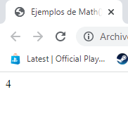 En este ejemplo simple, primero definiremos una funcion, en esta lo siguiente sera escribir una instruccion para escribir en el cuerpo del html, mediante esta instruccion escribiremos el resultado del metodo ceil y como valor pasamos a PI, este es un valor constante propio del objeto Math, por ultimo en el body del html hacemos la llamada a la funcion antes definida, veamos como es su salida: