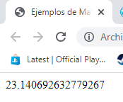 En este ejemplo simple, primero definiremos una funcion, en esta lo siguiente sera escribir una instruccion para escribir en el cuerpo del html, mediante esta instruccion escribiremos el resultado del metodo exp y como valor pasamos a PI, este es un valor constante propio del objeto Math, por ultimo en el body del html hacemos la llamada a la funcion antes definida, veamos como es su salida: