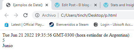 Como pueden ver nos devolvio todos los valores, observen como es la fecha completa que obtenermos al crear un objeto de tipo Date, en el segundo caso nos devolvio unicamente el valor que representa al mes de la fecha, recuerden que trabaja del 0 al 11 y no del 1 al 12, y por ultimo mediante un simple array pudimos convertir ese valor en el nombre del mes.