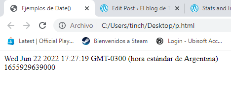 En este ejemplo simple, primero definiremos una funcion, en esta lo siguiente sera definir una variable donde almacenaremos la fecha actual, lo siguiente seran dos instrucciones para escribir en el cuerpo del html, en la primera mostraremos el objeto o variable definida anteriormente y en el segundo mostraremos solamente el valor devuelto por el metodo parse, por ultimo en el body del html hacemos la llamada a la funcion antes definida, veamos como es su salida: