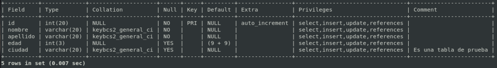 Este comando es ideal para cuando tenemos alguna duda sobre como se llaman o cuantas columnas posee una tabla, tambien nos brindara otra informacion que nos puede resultar de utilidad, primero veamos su sintaxis: