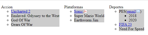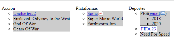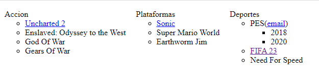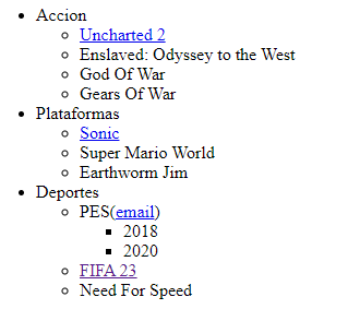 En este caso tenemos un simple listado de algunos videojuegos asignados a sus respectivos generos, con algunos sublistados, links y capacidad de enviar un email, si lo abren con un navegador se vera de la siguiente forma