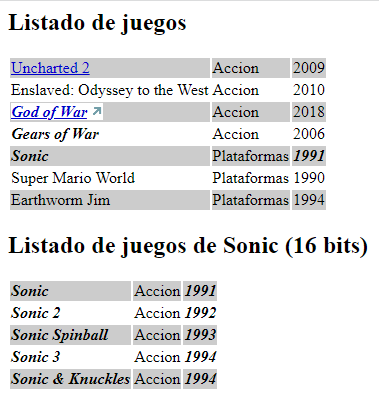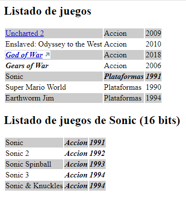 Observen que en este caso primero aplicamos el contains en las columnas para buscar las que contengan a Sonic, volvemos a usar a parent para que tome al elemento padre, despues por medio de find le diremos que busque la primer columna unida a este padre/pariente y le aplique la clase resaltar, observen que aplicamos el metodo para que finalice esta tarea pero luego volvemos a usar a find pero en este caso para que busque la tercer columna, y le vuelva a aplicar la clase resaltar, esto podriamos repetirlo todas las veces que necesitemos para otros elementos de este padre, si lo almacenan y recargan la pagina se vera de la siguiente manera