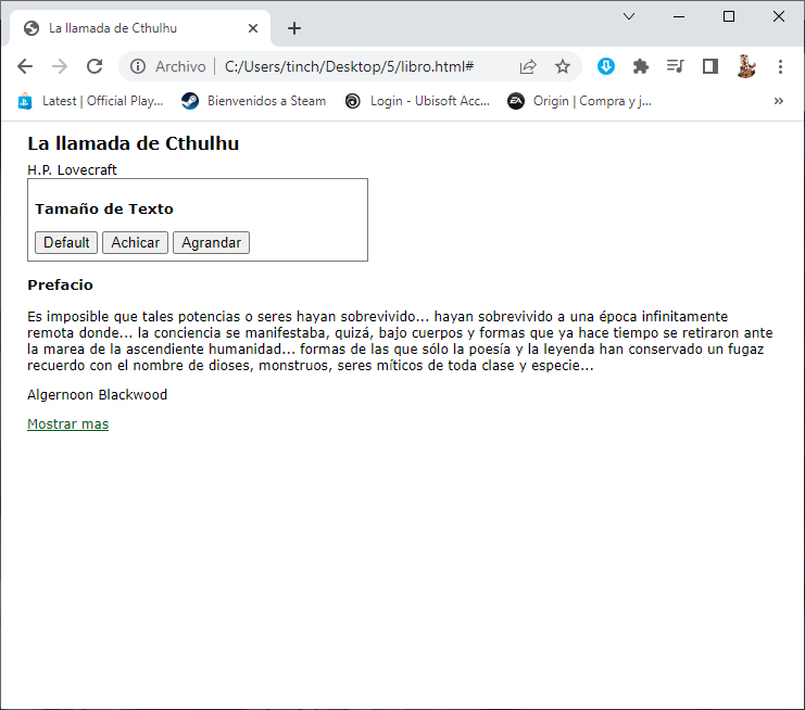 De vuelta esperamos a que la pagina este cargada, en ella asociaremos el evento click al link, la primera accion es asociar al evento la funcion preventDefault para evitar que el link haga su conducta habitual, la siguiente linea se encarga de mostrar el texto que escondimos por medio de show y lo siguiente es esconder el enlace que simula el reemplazo, con todo esto comentado veamos como funciona mediante el siguiente video