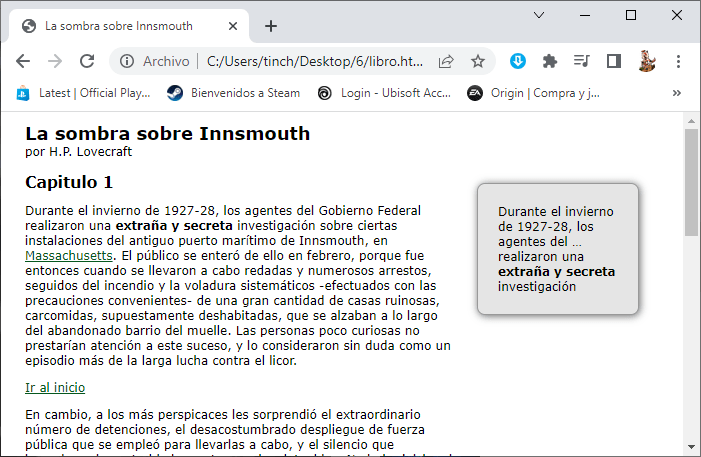 <p><span class="extracto-ejemplo">Durante el invierno de 1927-28, los agentes del Gobierno Federal realizaron una extraña y secreta investigación sobre ciertas instalaciones del antiguo puerto marítimo de Innsmouth</span>, en <a href="https://www.mass.gov/">Massachusetts</a>. El público se enteró de ello en febrero, porque fue entonces cuando se llevaron a cabo redadas y numerosos arrestos, seguidos del incendio y la voladura sistemáticos -efectuados con las precauciones convenientes- de una gran cantidad de casas ruinosas, carcomidas, supuestamente deshabitadas, que se alzaban a lo largo del abandonado barrio del muelle. Las personas poco curiosas no prestarían atención a este suceso, y lo consideraron sin duda como un episodio más de la larga lucha contra el licor.</p>