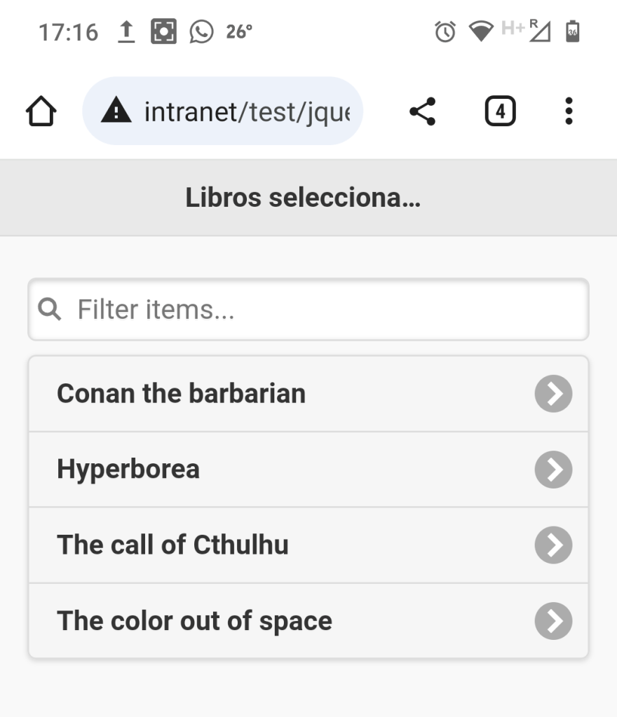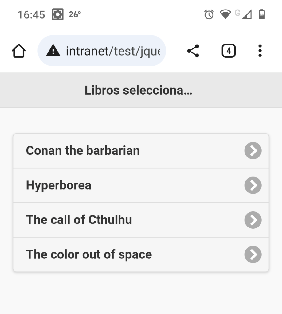 Observen que agregamos un nuevo par de divs, el primero llamado page, otro header y el contenedor de links como content, pero aqui viene la curiosidad porque en todo los casos usamos a data-role en lugar de id o class como haciamos antes, esto es asi porque esta libreria aplica todo en base a la palabra data- seguida de la accion, por ejemplo role para indicar cual es el rol que debe aplicar al elemento, si miran la pagina notaran que tiene un cierto orden, todo debe estar encerrado en un rol llamado page, dentro de esta tendremos uno que sirve como encabezado (header), luego uno para identificar el contenido (content) y en este caso no lo usamos pero tambien tenemos uno para el final (footer), con estos cambios si probamos nuestra pagina ahora se vera de la siguiente forma