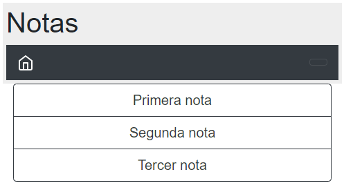 En este caso eliminamos la lista y agregamos dos div, el primero sera el contenedor y despues le agregaremos uno que representaria una fila (row), el siguiente sera otro div que sera las doce columnas que componen a esta fila, en este caso le decimos que cada uno ocupara el total de la pagina, seran botones en grupo verticales y por ultimo le decimos el rol de que sea un grupo, despues mantenemos el each para que busque cada elemento en listanotas y nos mostrara un link de cada nota y para este caso crearemos un boton para cada link, el link es exactamente lo mismo que explicamos en este post, si vienen de posts anteriores se daran cuenta de que solo hemos hecho modificaciones esteticas en la pagina de inicio, la mecanica no fue modificada, y si lo ejecutan se vera de la siguiente forma: