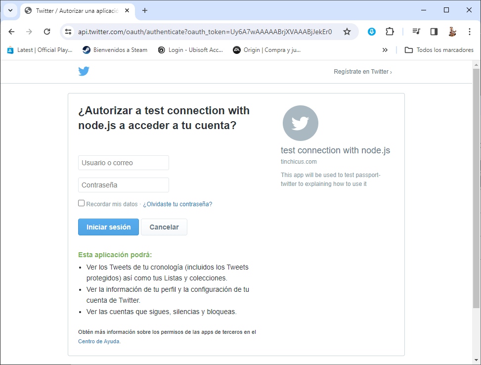 Aqui nos pasara todos los datos de nuestra app creada en el portal de Twitter, con los permisos que hayamos concedido y todas las especificaciones que hayamos pasado, aqui simplemente deben poner el usuario y contraseña de la red social para poder ingresar, si tienen doble autenticacion se las pedira luego, y una vez ingresado aparecera la siguiente pantalla