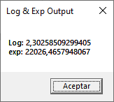 First, we define a variable with a value. Then, we define a new variable where we store the result of log with above variable and we indicate with a text that is the log operation. The next is concatenate another text indicating the exp operation and concatenate the result of exp in number. Finally, we show the final text in text. Let’s watch how is its output: