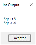 We take the example of sqr and we apply int to its result and we concatenate the same operation to the variable text but with the negative sign to the second square root. Finally, we show the final value on text. Let’s watch its output: