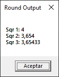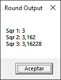 Again we use the example of sqr but this time we repeat the operation with sqr three times. To each operation we apply the round function and in each case we use a different amount of digits. In the first case, we don’t pass any number, for the second case we pass three digits and five digits in the third case. All these values we store in the variable text and finally we show these values. Let’s watch its output: