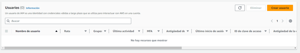 Este nos desplegara todos los servicios disponibles. Aqui debemos ir hasta Seguridad, Identidad y Conformidad. En esta seccion buscaremos la opcion al servicio de IAM. Esto nos redireccionara a la seccion de administracion de usuarios, grupos y roles para ingresar a nuestros servicios sin root. A la izquierda tienen un acceso llamado usuarios, si lo presionan los mandara a esta seccion y debera aparecer algo como esto.