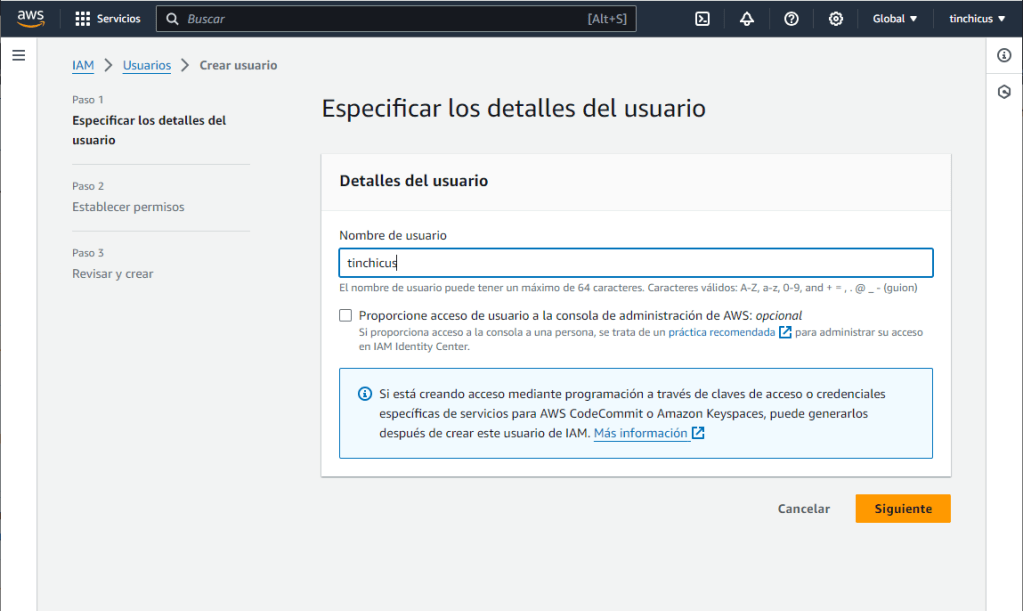 A la izquierda tenemos los tres pasos, el primero sera ingresar la identificacion del usuario o el nombre que le asignaremos. Observen que podemos tildar para que tenga acceso a la consola en lugar del usuario root. Como indica esto es una buena practica, especialmente en equipos con sistemas basados en Unix donde no se recomienda usar al root para el ingreso salvo para operaciones muy especificas. Asi que podemos tildarlo pero no es obligatorio. En mi caso no lo voy a hacer. Tambien abajo nos hace una observacion indicando que podemos usarlo para lo que vamos a hacer en este post, crear una clave de acceso. Pongan el nombre y presionen siguiente para pasar al siguiente paso.