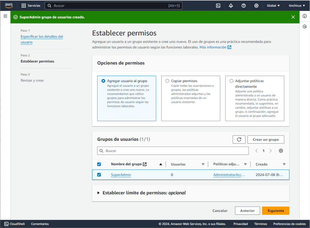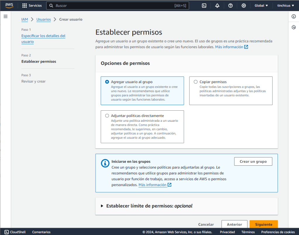 En el segundo estableceremos los permisos para este usuario, como en todo sistema que se precie estos se asignan mediante grupos y no directamente. Esta es una mejor practica porque asi tambien podemos establecer mejor los permisos en base al rol que debe tener el usuario pero esto no quita que podemos copiarlos de otro o aplicarle las politicas directamente. Si estas como en mi caso y no tienes ningun grupo creado, presiona el boton de Crear un grupo y nos abrira la siguiente opcion: