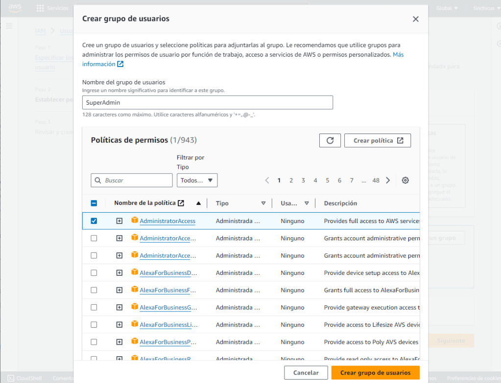 Primero estableceran el nombre del nuevo grupo, luego deben asignarle el tipo de politica que manejara. En mi caso elegi la primera porque es la que garantiza acceso total a la consola, como si fuera root, y evitaremos tener inconvenientes a la hora de acceder mediante la clave de acceso. Esto lo hago asi porque es solo para practica y estudio pero en la vida real traten de ser mas especificos porque podemos tener inconvenientes de vulnerablidad a nuestras aplicaciones. Si observan tienen un monton de politicas para poder administrar las distintas aplicaciones que disponemos, lo cual nos da la posibilidad de poder crear grupos especificos para un sector y ese sector solo adminsitrara eso sin interferir en otros sectores que tendran sus respectivas tareas. Tambien tienen la posibilidad de poder crear su propia politica pero ese no sera un tema que ahondaremos en este post. Quizas en un futuro puede dedicarle uno a como son las politicas. Una vez seleccionado presionan el boton de Crear grupo y nos cerra esta ventana y volveremos a la anterior pero con esta diferencia.
