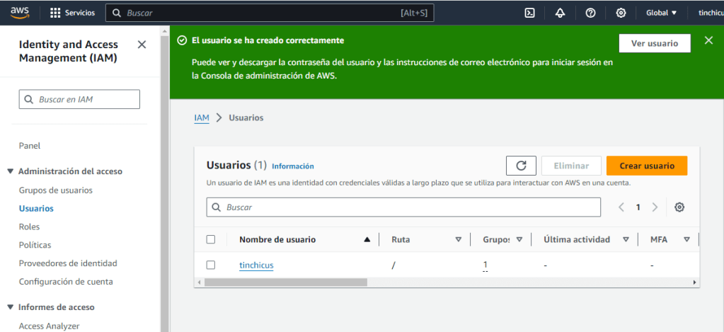 En este ultimo paso crearemos el usuario y aqui podemos revisar todos los datos antes de crearlo. Como no tilde la opcion de la consola, no establecimos una contraseña para este usuario. Seria un equivalente a un usuario de servicio en Unix donde manejara algun daemon pero no podemos usarlo para acceder al equipo. Presionen Crear usuario y procedera a crear al usuario, si todo es exitoso veremos una pantalla similar a esta.