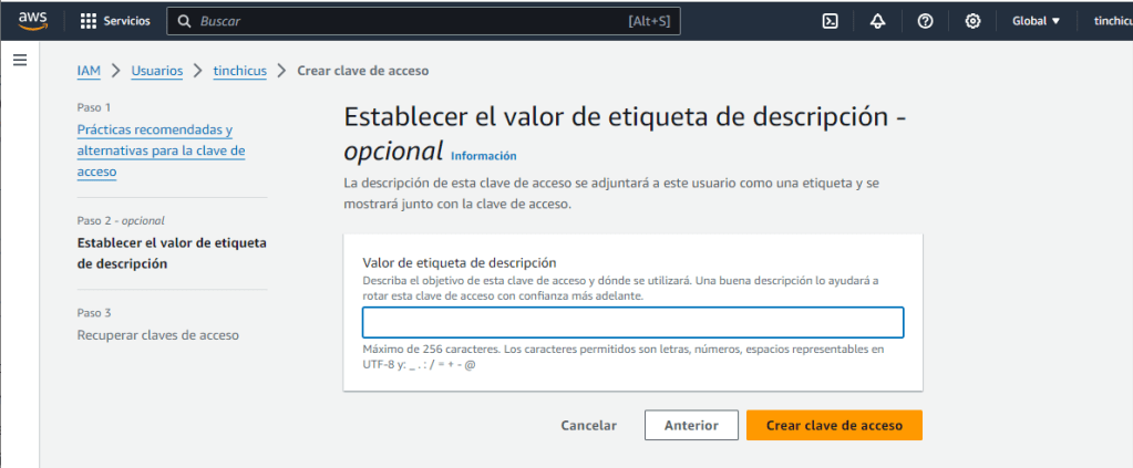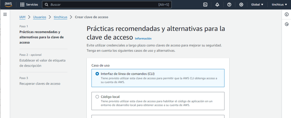 Aqui estableceremos para que tipo de acceso usaremos la clave, en mi caso sera para la linea de comandos (CLI) pero tambien tenemos mas opciones como se ve en la imagen, codigo local, y estas otras opciones: Aplicacion ejecutada en un servicio AWS, Servicio de terceros, Aplicacion por fuera de AWS, Otros. Siendo este ultomo para servicios muy especificos. Inclusive tenemos unas opciones que nos proporciona AWS para manejarlos de otra forma. Si van a seguir con mi blog, por el momento les recommiendo elegir la primera opcion. Al final tienen una opcion para darle el visto bueno, lo seleccionan y con el boton Siguiente pasamos al siguiente paso.