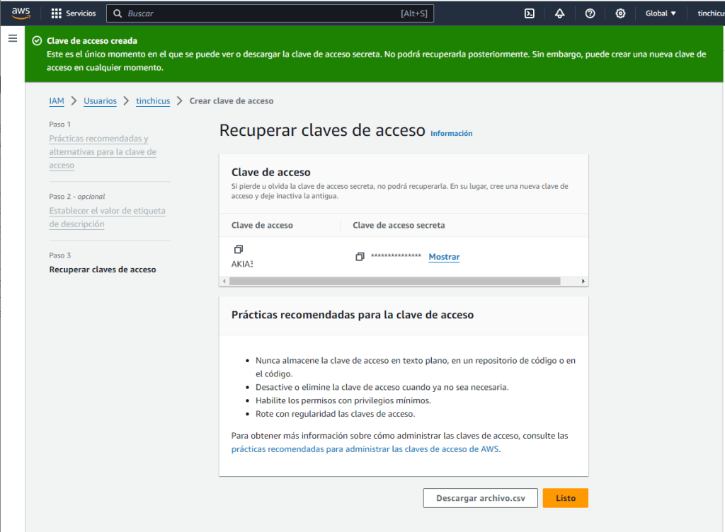Ahi veremos a la clave de acceso y la clave secreta, estos dos valores son los que usaran para poder acceder a los distintos servicios de AWS mediante las API que generen o utilicen. Estas deben almacenarlas, traten de seguir los tips que indica debajo de estas, y no los pierdan porque como indica arriba no se pueden recuperar las mismas pero si se pueden generar nuevamente con los pasos anteriores. Con todo esto comentado presionenn listo y ya queda completamente generada nuestra clave de acceso. Ahora en la consola veran la nueva clave que generaron y nos dara la opcion de poder generar una nueva en caso de necesitar otro tipo de acceso. Por esta razon es bueno asignarle una etiqueta para saber que acceso nos brinda cada clave.
