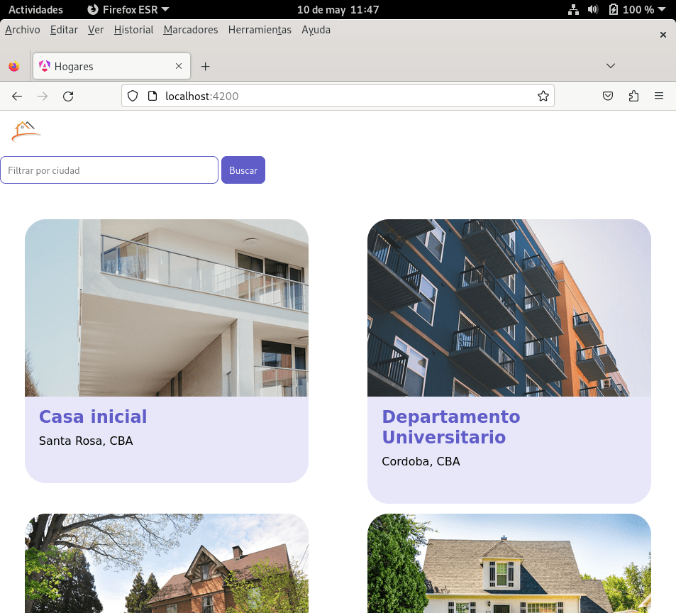 En este caso solo hicimos una modificacion, dentro de la seccion resultados tomamos al tag encargado de mostrar el contenido y le agregamos a ngFor, el cual actua como un for mejorado o generico, como lo conozcas, y devolvera cada elemento que posea la coleccion que le informemos.. Esta es la razon por la que le cambiamos el nombre al listado de casas. Y el dato que enviamos tiene el mismo nombre que antes para que sigamos utilizando la estructura anterior. Con esto realizado, la pagina debe funcionar nuevamente y verse de la siguiente manera: