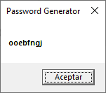 This code can generate a password mixing random characters.To make this we use a for to count eight numbers, in the block we generate a random number between 97 to 122. This range are the letters a to z, the returned character is concatenated to preceding text in pass. Once the loop is finished, we show the text in pass with a msgbox. Let’s watch how it’s its output: