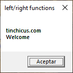 We declare two variables, it’s not necessary but it’s a good practice, and we assign a string to text. Then we use right function to extract a segment from text, and assign it to part. Next we use left function with text and the result we concatenate it to the previous value. Finally, we show the final value in part. Let’s watch its output: