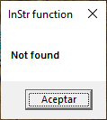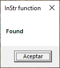 We assign a string to text, in pos we store the result of InStr function. For this case, we pass the preceding variable and a text to search. On the conditional, we evaluate whether pos is equal to zero. If we accomplished this condition, we show a message indicating that was not found. Otherwise, we show a message indicating that was found. Let’s watch its output: