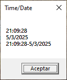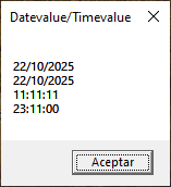 We define four variables, in each one we store the result of both functions. In the first two we use to datevalue with two formats. In date1, we pass an standard format but for the next variable (date2) we pass an unusual format and with number sign. The other variables are used for timevalue. In the first case, we pass all the values that can be used to set the time. In the another variable we use a value and the modificator. Finally, we concatenate all values in one variable and we show it. Let’s watch its output: