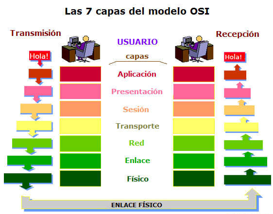 La primer capa es la encargada de recibir la informacion que enviaremos. En la parte de transmision, a medida que vamos pasando de una capa a la otra se va a agregando el encabezado especifico de la misma. Una vez alcanzada la ultima capa se procede a enviar este paquete. Cuando llegue al equipo receptor, este pasara nuevamente por cada capa del modelo pero ahora removera cada uno de los encabezados hasta que solamente quede la informacion original.