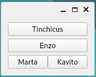 Seguimos creando la ventana pero ahora en lugar de tener un solo boton crearemos cuatro pero no los asignaremos a la ventana. Lo siguiente sera crear el layout para los botones, en este caso usaremos a QVBoxLayout, este genera un orden vertical de los elementos, y luego mediante addWidget agregaremos cada uno de los botones anteriores en el layout. Con nuestro layout completo, lo siguiente sera asignarlo a la ventana y finalmente mostrar la ventana y devolver la aplicacion. Si lo compilan y ejecutan deben tener lo siguiente:
