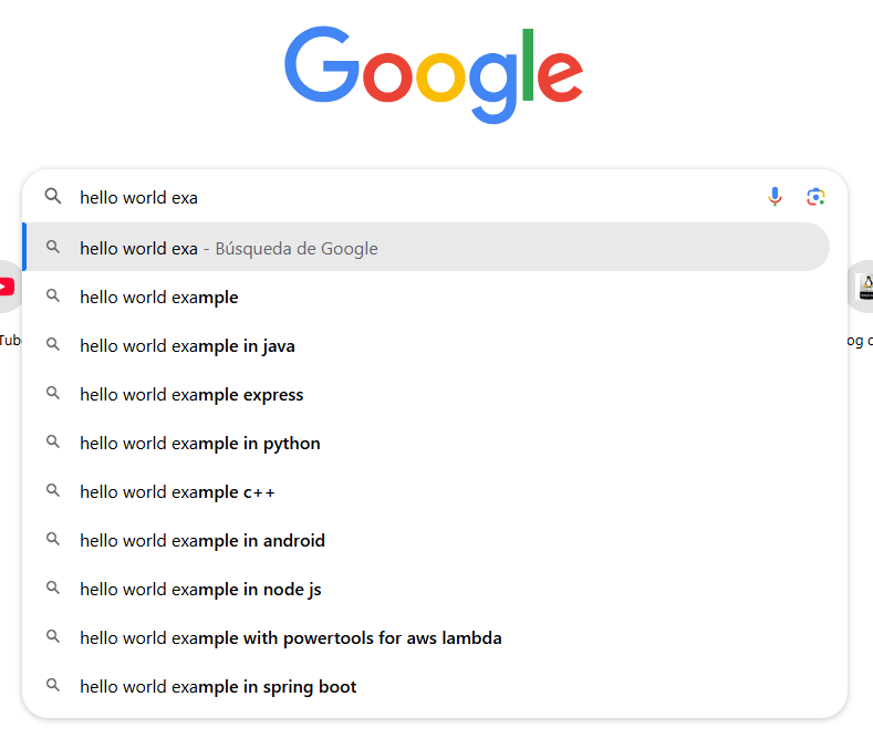 No lo tomen solo como algo pensado para gente perezosa, aunque un poco si, sino que tambien como una sugerencia porque a veces las personas no saben que buscar exactamente o corregir la manera que debe ser buscado. La idea no es centrarnos en la interfaz sino en la lista de sugerencias, por esta razon nos centraremos en todo el transfondo del engine de busqueda. Si observan la imagen, pueden ver como nos sugiere multiples opciones para lo que estamos buscando. Sin embargo, antes de que comencemos a hablar sobre esto debemos tener en cuenta que el buscador que analizaremos en los proximos posts sera mas de dialogo de texto. Es decir, a medida que ingresemos la solicitud a buscar este ofrece varias posibilidades para poder limitar la lista de resultados. Si tomamos el caso que se ve en la imagen, el ejemplo de Hello, World es el mas basico que se usa como primer ejemplo para cualquier lenguaje. Observen como a medida que lo ingresamos este nos sugiere el ejemplo para distintos lenguajes y/o frameworks. A medida que especifiquemos mas informacion se ira limitando la lista de propuestas para el usuario y mejorando la experiencia.