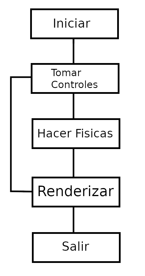 Este es el ciclo mas basico de un videojuego, siempre va a tener un comienzo donde inicia, verifica o toma los controles (es decir nuestra interaccion). Luego hace las fisicas o rutinas pertinentes como pueden ser el caminar, disparar, atacar, etc, para luego renderizar o dibujar en la pantalla el resultado del bloque anterior. En este chequea si debe volver a repetir el proceso o de lo contrario salir del bucle.
