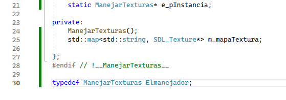 Con esto ya terminamos en la parte del archivo de encabezado, pasemos a ManejarTexturas.cpp donde debemos hacer varias modificaciones. Siendo la primera en definir a nuestra variable e_pInstancia y para ello agregaremos la siguiente linea: