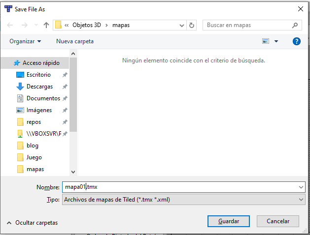 En esta ventana, elegiremos donde guardaremos el nuuevo proyecto y asignaremos el nombre que lo identtificara. Presionan Guardar, y ya teemos nuestro proyecto creado, pasemos a completarlo. Nuevamente, vamos a Archivo, a Nuevo, y ahora elegimos a Nuevo Mapa. Esto nos abrira la siguiente ventana