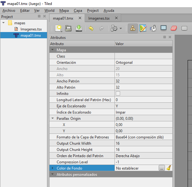 Las tres primeras opciones deben dejarlas como aparecen porque es el mas generico y simple que podemos elegir. Elegimos ese formato de la capa de Patrones para tener una version mas compacta del mapa pero sobrer esto hablaremos un poco mas adelante. Al igual que en la imagen, deben establecer un ancho de 20 patrones y alto de 15 patrones. Y el tamaño de cada patron lo haremos de 32×32 pixels. Presionen Ok para crear este nuevo elemento. Lo cual generara lo siguiente: